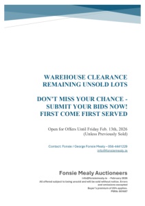 WAREHOUSE CLEARANCE REMAINING UNSOLD LOTS DON’T MISS YOUR CHANCE - SUBMIT YOUR BIDS NOW! FIRST COME FIRST SERVED Open for Offers Until Friday Feb. 13th, 2026 (Unless Previously Sold) Fonsie Mealy Auctioneers info@fonsiemealy.ie - February 2026 All offered subject to being unsold and will be sold without notice. Errors and omissions excepted Buyer’s premium of 2 5% applies. PSRA: 001687 Contact: Fonsie / George Fonsie Mealy – 056-4441229 info@fonsiemealy.ie